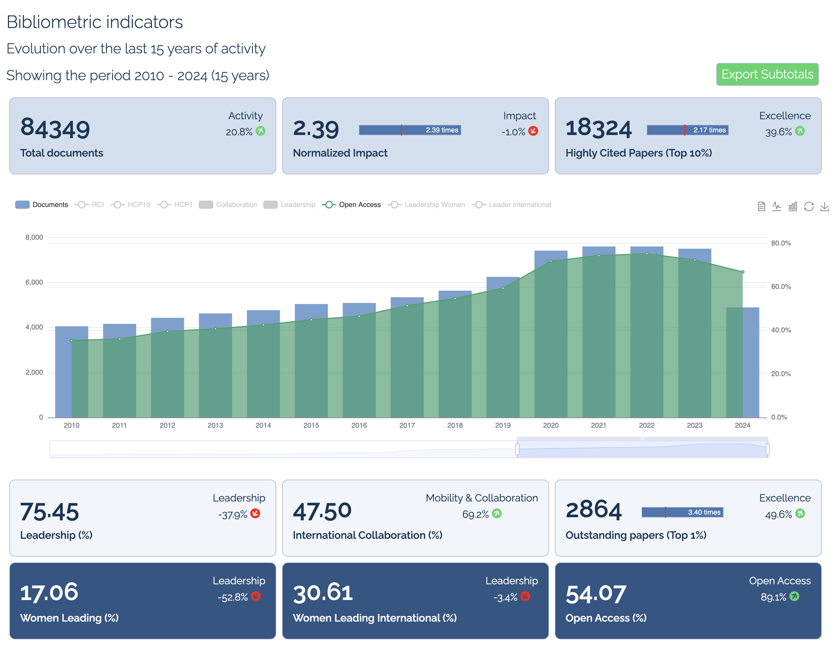 Gain insights into research performance and human resources with detailed bibliometric indicators like publication counts, normalized impact, excellence, or leadership. Human resource indicators classify researchers by career stage and productivity, emphasizing gender diversity and output efficiency. This integrated approach supports informed decisions for institutional growth and global impact.